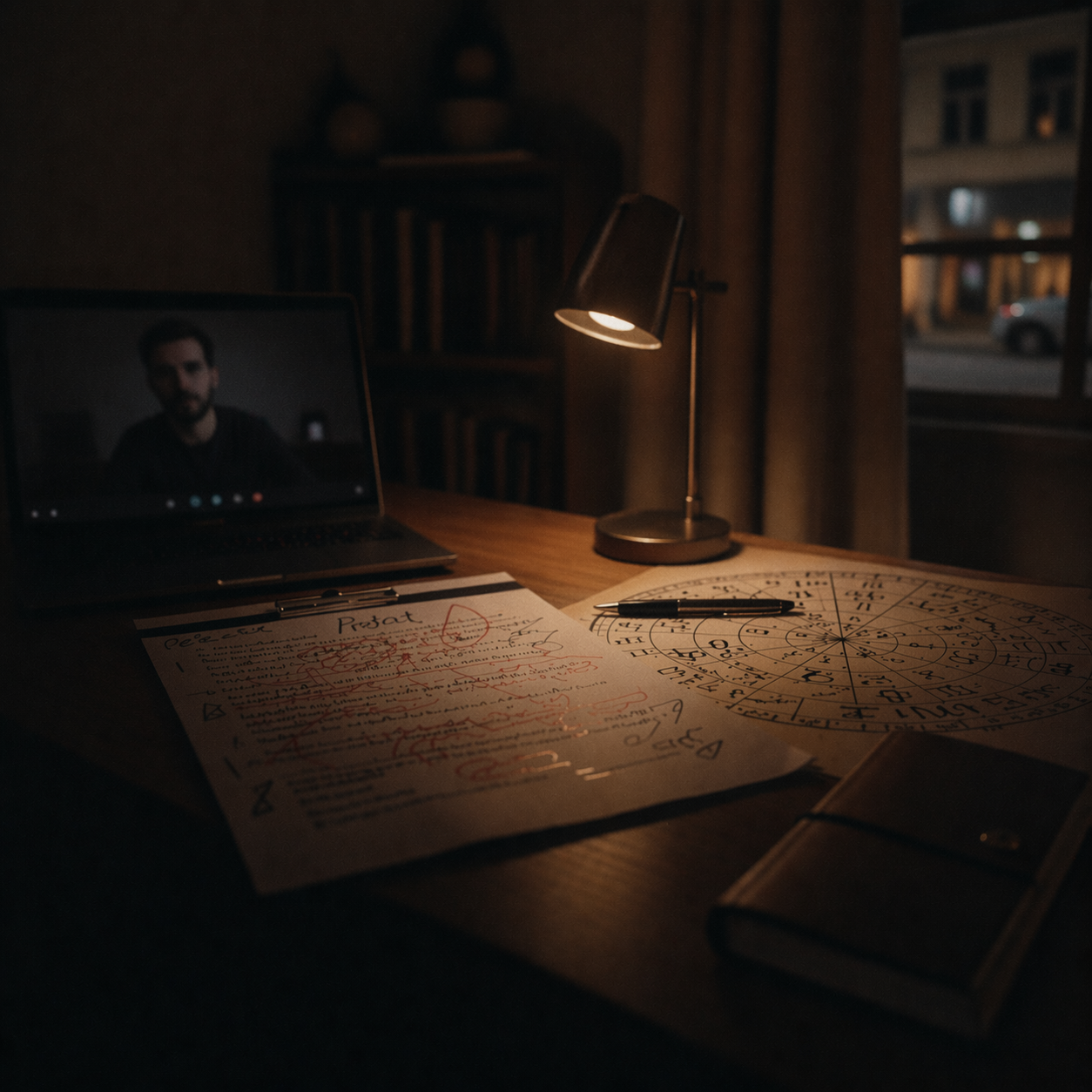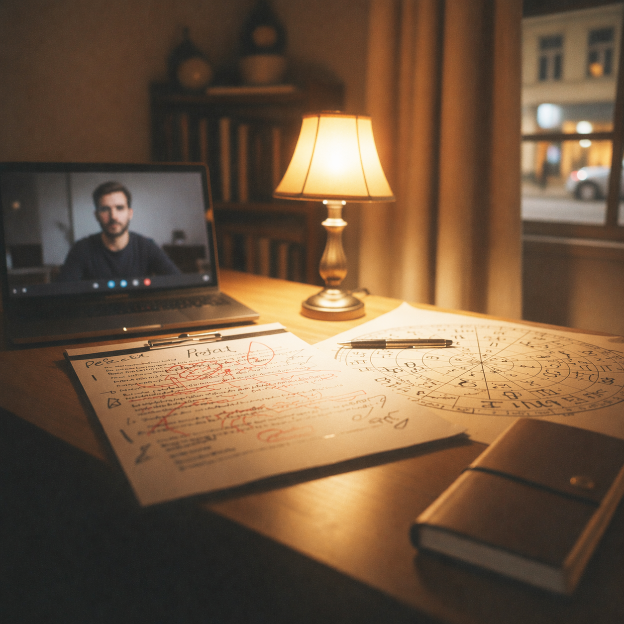 Sesiones online individuales para mirar tu trabajo escénico con mayor precisión. Son espacios de exploración y ajuste expresivo orientados por la carta natal y la lectura de la escena. No hace falta saber astrología; si ya tenés conocimientos, pueden integrarse al proceso.
